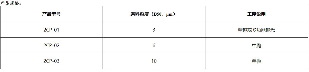 目前思瑞恩推出了三種型號。2CP-01型號,磨料粒度為3μm,適合精拋或多功能拋光;2CP-02型號,磨料粒度為6μm,適合中拋工序;2CP-03型號,磨料粒度為10μm,適合粗拋工序。